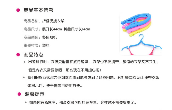 我們的旅行衣架為您細致而周到地考慮到了這些問題,其折疊式的設計,使得衣架體積小巧便捷、便于攜帶且使用方便。